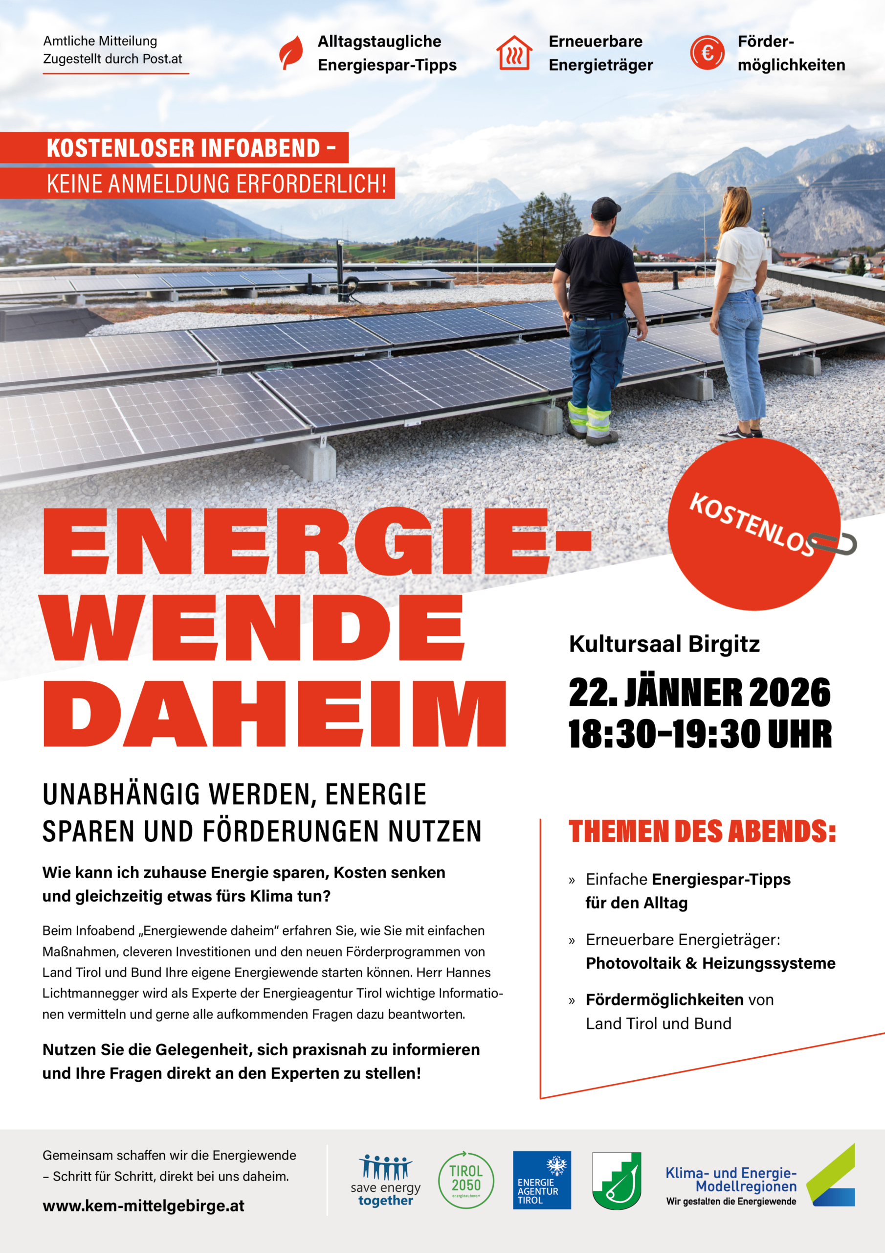 Unabhängig werden, Energie sparen und Förderungen nutzen Wie kann ich zuhause Energie sparen, Kosten senken und gleichzeitig etwas fürs Klima tun?Beim Infoabend „Energiewende daheim“ erfahren Sie, wie Sie mit einfachen